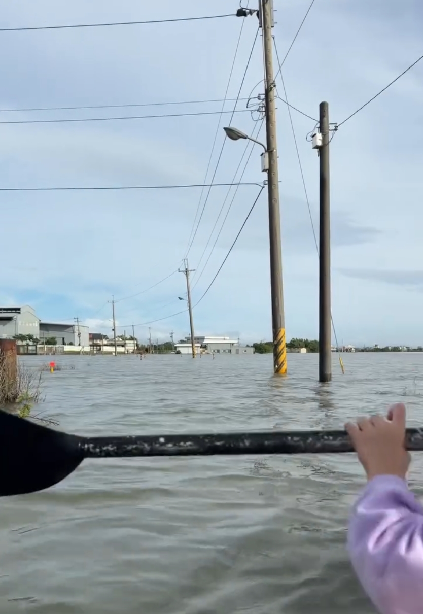 一位當地居民今早與女兒划著獨木舟出門,準備去買早餐,畫面曝光後立刻在Threads上爆紅。影片中,只見父女倆在水面上前進,周圍只剩電線桿和屋頂若隱若現。爸爸苦笑說:「這速度買早餐可能變午餐了!」幽默一句化解災情帶來的不便,也讓網友笑中帶淚。