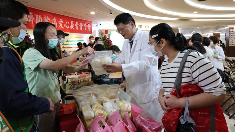 如往年一樣,大廳舉辦濟助貧病愛心義賣會,善心人士捐贈的物品供民眾認購,所得將捐給醫院的「社會服務暨醫療救助基金」專戶,濟助貧病醫療費用,現場社工室人員及志工拉大嗓門吆喝,民眾尋寶,挹注愛心,很多推著輪椅的外籍照護者也來搶構,形成義賣會特別的畫面。