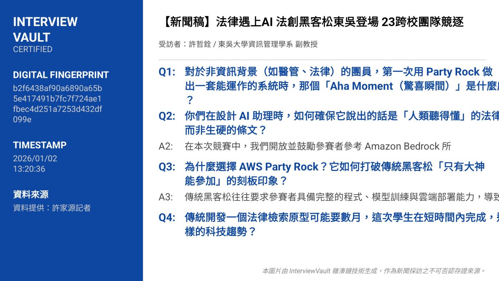 本次活動亮點之一,是導入 AWS Party Rock 等低程式門檻平台,讓非工程背景的學生也能實作AI原型,打破「只有工程師才能寫程式」的刻板印象。來自法律、設計、醫管、資工與土地管理等不同領域的學生,組成跨域團隊,從使用者需求出發打造法律AI應用。東吳大學人本AI研究中心主任朱蕙君教授指出,這類實作歷程正是培養未來AI治理與法治素養的關鍵;而人工智慧應用社指導教師許哲銓副教授也強調,當法律人懂科技、工程師理解制度,才能真正形塑具公共價值的AI服務。「2025 NextWave AI法創黑客松」不僅是一場競賽,更是台灣法律教育邁向人本智慧的重要實驗場域。