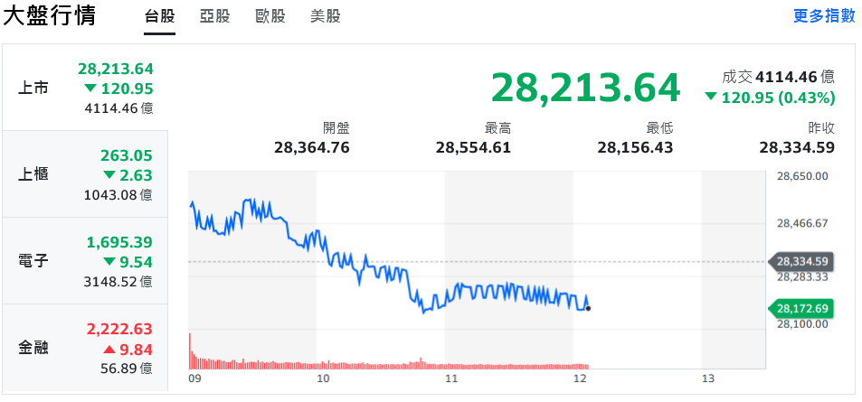 台積電週二(4日)早盤再攻高,助攻台股再攀28554新高點,之後隨獲利了結賣壓湧現,加權指數反轉向下跌逾百點,高低波動近400點,櫃買指數跌幅超過1%,預估今日成交量約6300億元。