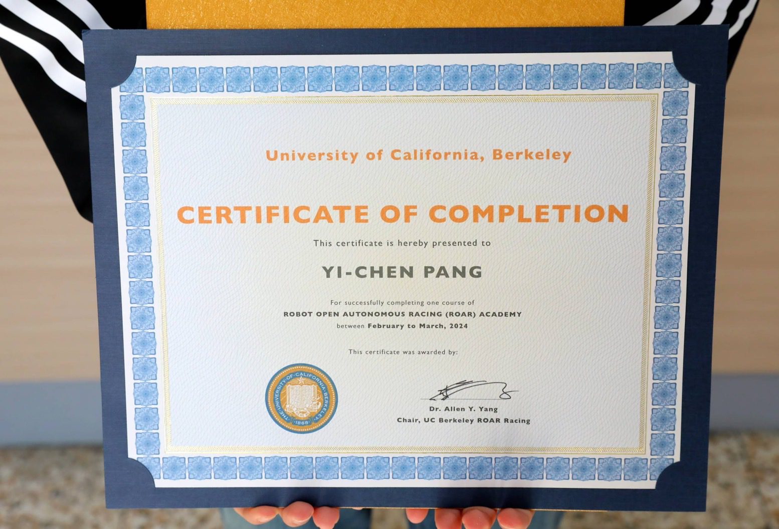 加州大學柏克萊分校的機器人開放自主競賽學院「ROAR Academy」(Robot Open Autonomous Racing)課程結業證書