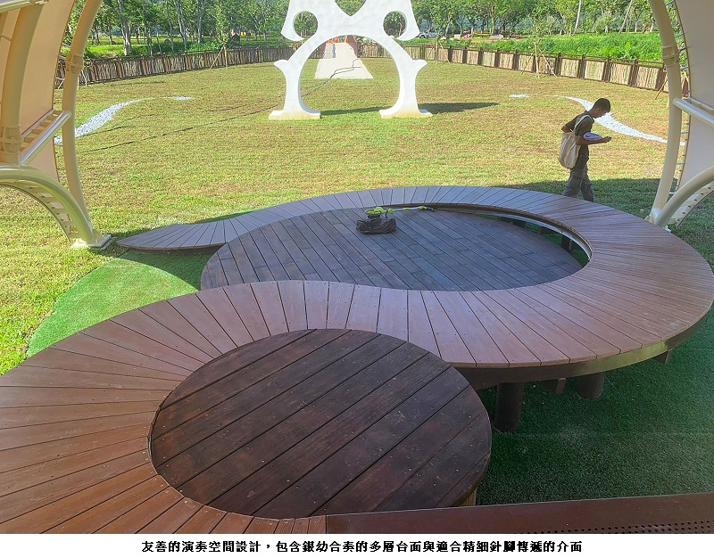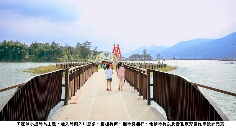 這次榮獲美學與景觀類首獎的大埔鄉和平社區音樂饗宴暨大地療育設施改善工程,以「音樂」、「自然」、「療癒」為核心,將小提琴工藝、音樂教育與在地湖畔景觀整合,打造沉浸式的地景與展演空間。工程以「小提琴」為主題發想,設置琴頭入口意象、指板橋面、鋼琴鍵欄杆、地景琴橋及音孔療育設施,使整個場域成為可親近、可體驗的音樂地景。