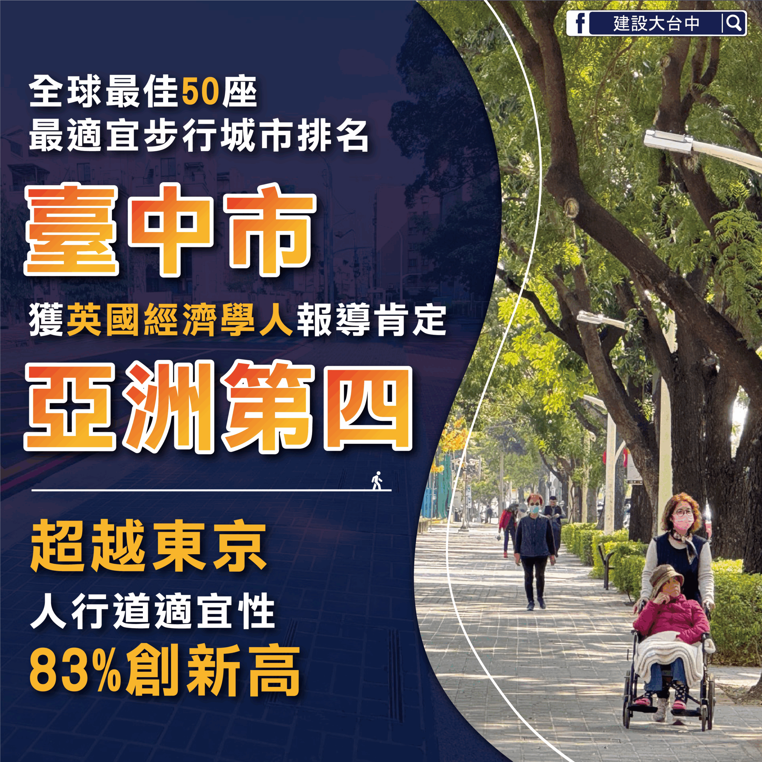 (報新聞/鄒志中 特稿) 台中市在「人本交通建設」方面取得了令人矚目的成就:人行道新建與整建總長度達到182.3 公里,人行道適宜性(Suitability)指標宣稱提升至83%,通學步道改善超過38公里。這些努力更使台中在《經濟學人》智庫(EIU)的評比中,躍居全球第49名、亞洲第4 的步行友好城市。