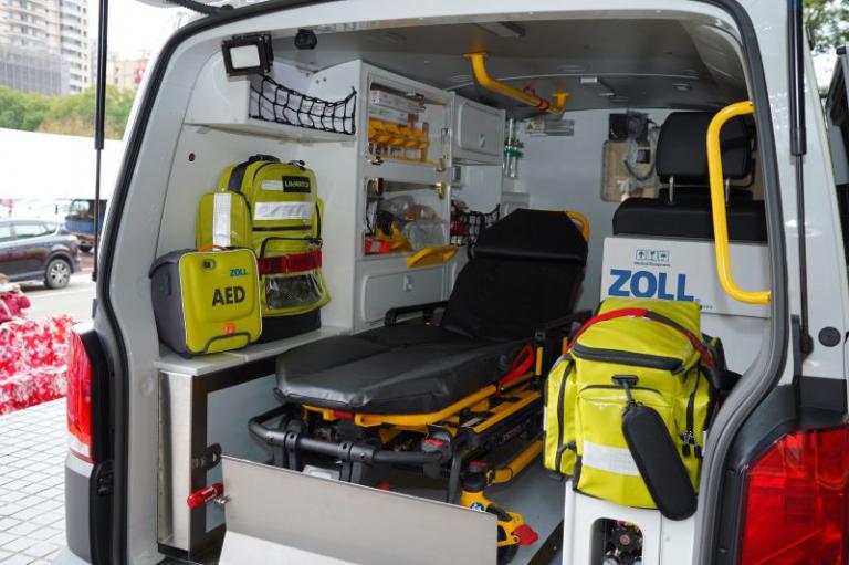 今日獲贈救護車配備多項先進器材,包括電動擔架床、攜帶式自動電擊器、履帶式搬運椅、自動給氧器、小兒擔架床固定裝置組,以及成人與幼兒用骨盆固定器,電動擔架床能有效減輕救護人員在搬運病患時的腰部負荷,提升作業安全,攜帶式自動電擊器則是處理OHCA患者不可或缺的關鍵急救裝備。