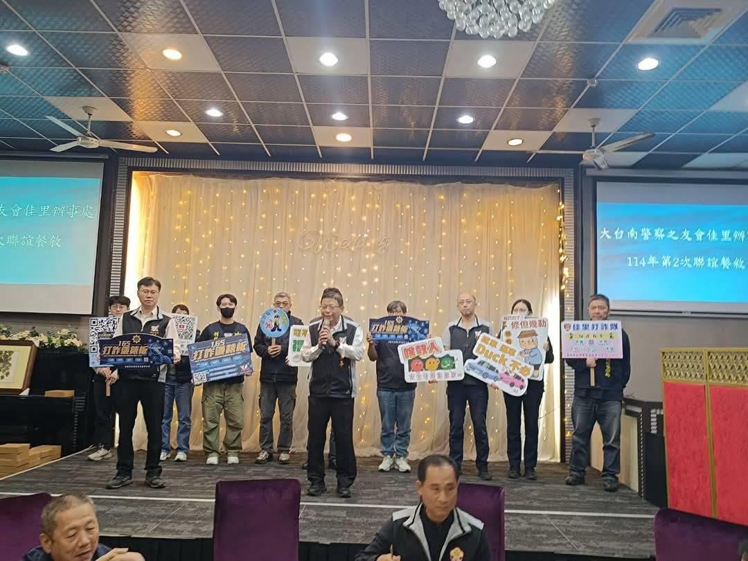 台南市大台南警察之友會佳里辦事處隊舉辦114年第2次警民聯誼餐會活動於本(12)月17日18時36分假佳里區蔘天地宴會餐廳舉行,佳里警友幹部、警友顧問及眷屬共約300人參加,享受心靈餐會活動,席開30桌,座無虛席,出席來賓包括台南市政府警察局局長林國清、副局長莊勝雄、立委郭國文、市議員陳昆和、蔡蘇秋金、蔡秋蘭、謝舒凡、方一峰服務處助理李寶桐、佳里區公所主任秘書林昭陽、大台南警察之友會秘書洪榮哲、常務理事黃正華賢伉儷、佳里辦事處主任周文雄、副主任洪華峰、黃惠雄、黃景楓賢伉儷、李聖良、 蘇啟瑞、幹事潘文賝、顧問團長黃慶淵、副團長邱俊騫、學甲辦事處主任黃世偉、副主任黃俊達、金唐殿主任委員黃維明賢伉儷、金唐殿上元燈慈善會會長楊志超、台南市寢具公會理事長吳松儒、台南市政府警察局警政監林郁誌、佳里分局長施衣峯、副分局長黃胤銘、李國榮、前佳里分局副分局長陳榮修賢伉儷、組長許炳元、佳里分局民防中隊長陳駿逸、義警中隊長蔡寶財、佳里警友站站長陳建智、臺南市政府警察局路老師李晟邦警官、佳里奇美醫院公關室主任林正雄、佳里民防中隊顧問團團長蔡榮心等各警友站幹部及賢達三百多人共襄盛舉,場面溫馨。