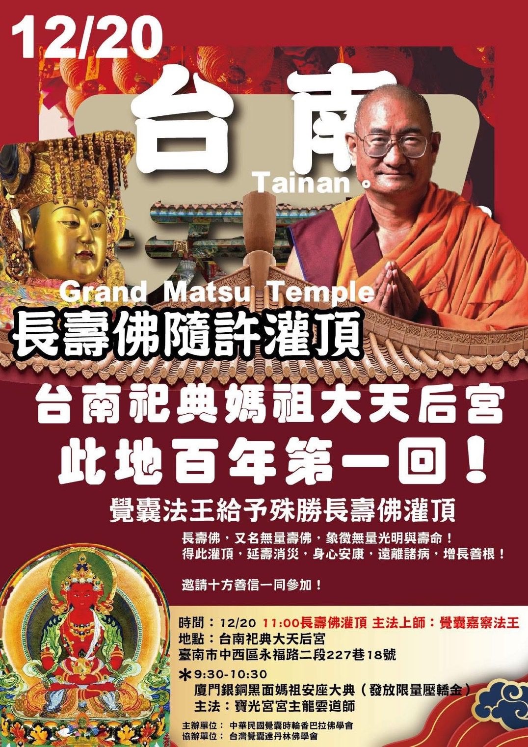 此篇文章最開始出處為: 官廟迎法王.百年首見 覺囊嘉察法王12/20將蒞臨台南祀典大天后宮 主持長壽佛灌頂