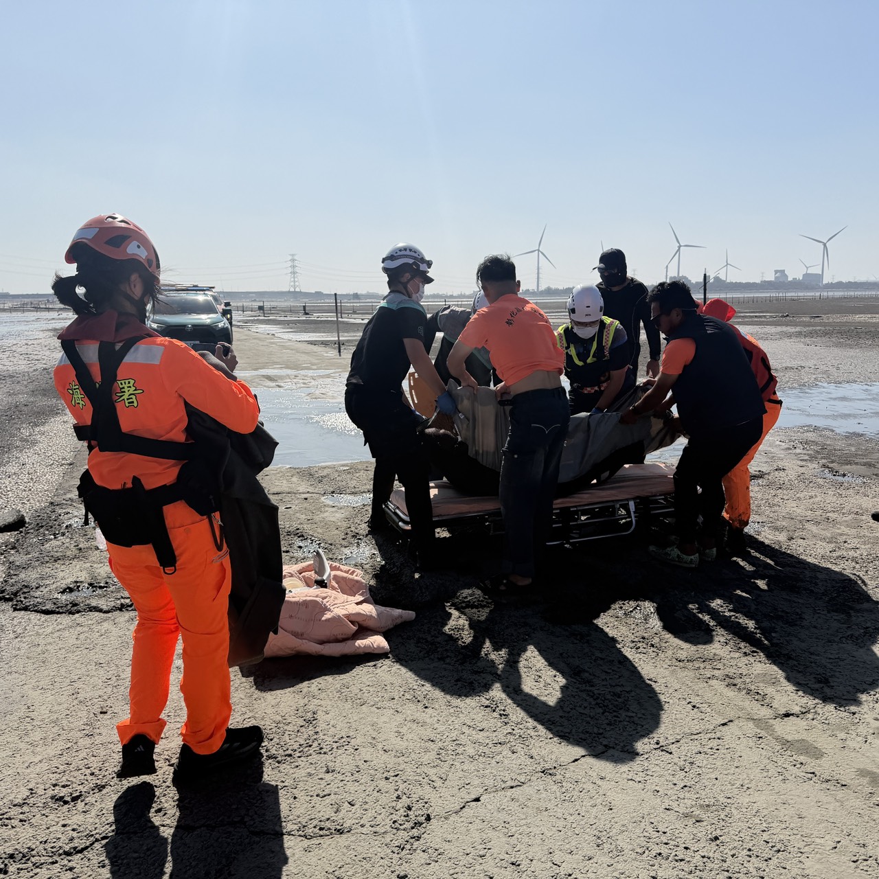 海巡署表示,今(23)日8時許,海巡署中部分署第三岸巡隊麗水安檢所接獲第四巡防區通報,海尾蚵道2名民眾落海待援,隨即派遣安檢所同仁攜帶救生救難裝備及派遣救生艇、無人機區隊馳赴現場。8時37時,海巡人員抵達海尾蚵道,經詢問報案人,確認2位民眾於海尾蚵道距岸約3公里處失足落水,海巡人員隨即會同消防及彰化救難協會人員前往救援;9時38分時,抵達現場後,1名民眾已無呼吸跟心跳,立即以擔架搬運回岸際,並送往彰化秀傳醫院急救;另持續搜索另1名落海失蹤民眾,並通報海巡隊線上艇及申請空勤總隊派遣直升機救援。