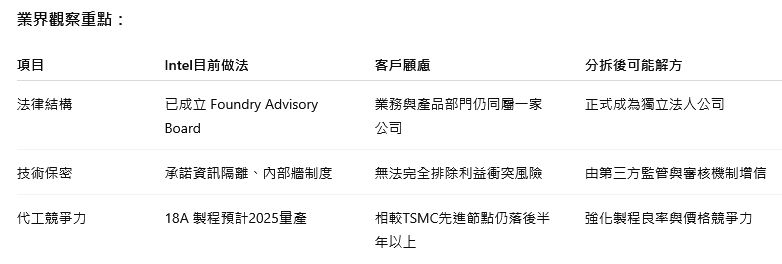 英特爾副總裁皮策爾(John Pitzer)近日在UBS年度會議中對此回應,Intel Foundry已成立專屬諮詢委員會,且正朝「法律上獨立實體」方向推進。皮策爾強調:「我們正在為這個選項創造條件,並非只是為了內部組織重組,而是回應客戶希望代工業務能更具獨立性。我們會持續推進,若董事會認為正式分拆能創造價值,就不會拖延。」